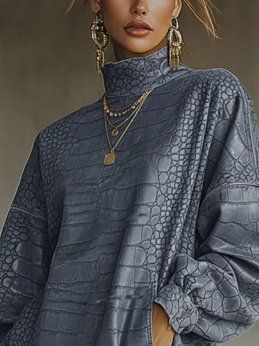 This striking blue mini dress blends modern elegance with a playful edge. The crocodile-embossed texture gives depth and a luxurious feel, while the fringe hem adds movement and a hint of drama. Its high collar and long sleeves create a sleek silhouette that's both versatile and eye-catching. Pair with bold accessories and heeled boots to amplify the style, making an unforgettable fashion statement at any event.