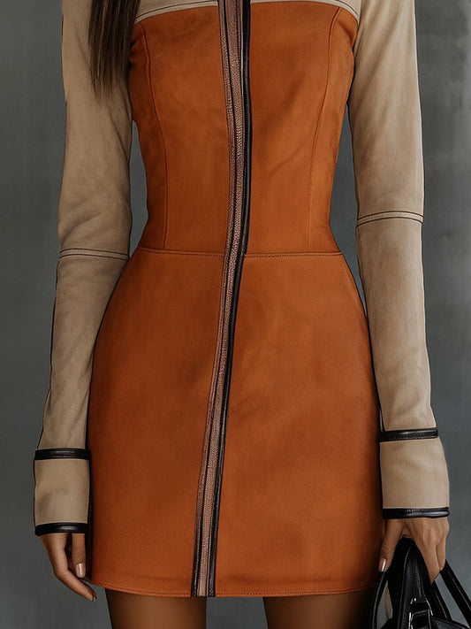 This elegant two-tone suede mini dress stands out with its sophisticated contrast between tan and rust shades, complemented by sharp black accents. The luxurious suede material and contemporary design elements make it perfect for cooler seasons, combining warmth with style. The high neckline and structural fit add sophistication, making it a versatile piece for various occasions.