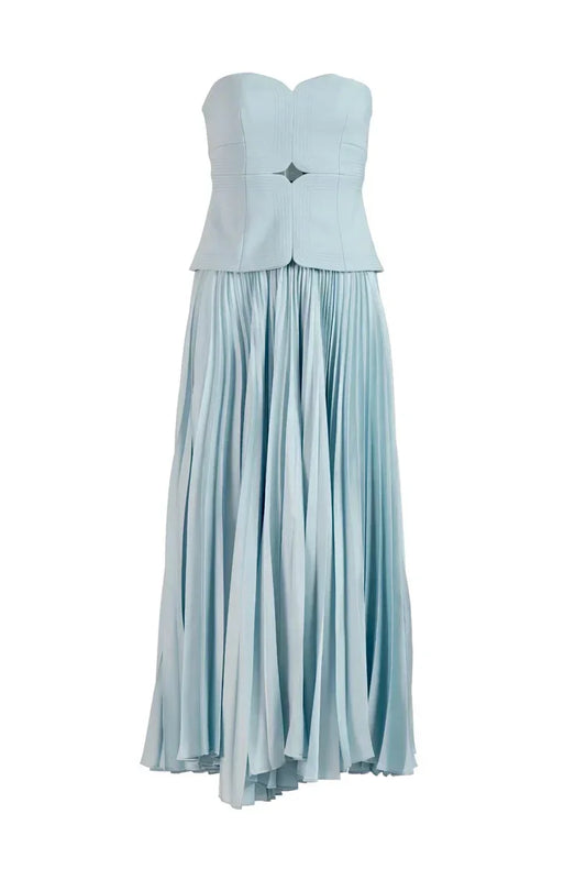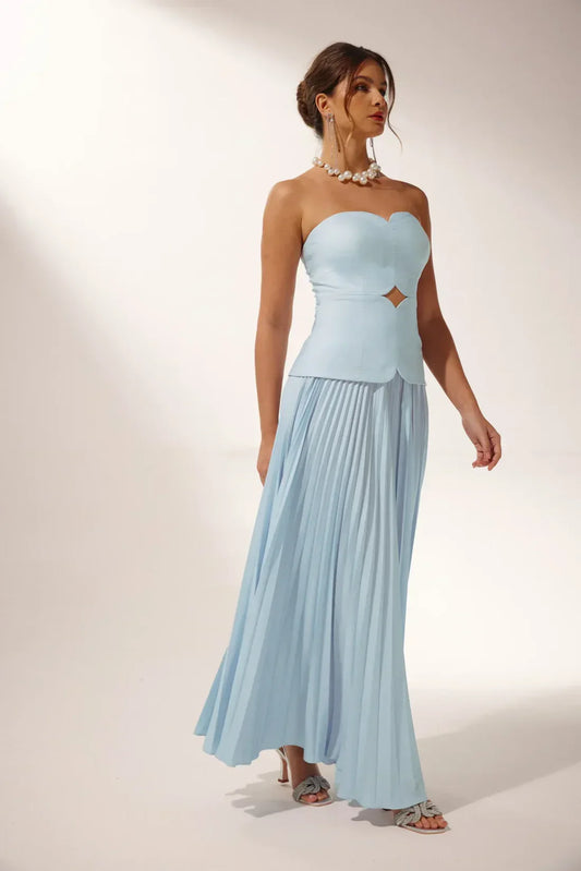Designed for both modern elegance and classic beauty, the corset top features a subtly structured bodice that flatters the waistline, while the pleated skirt flows gracefully with every step. Perfect for summer soirées, garden parties, or any event where elegance is a must.