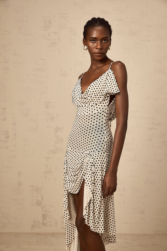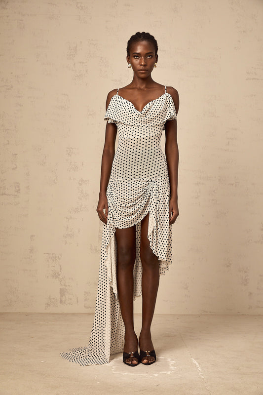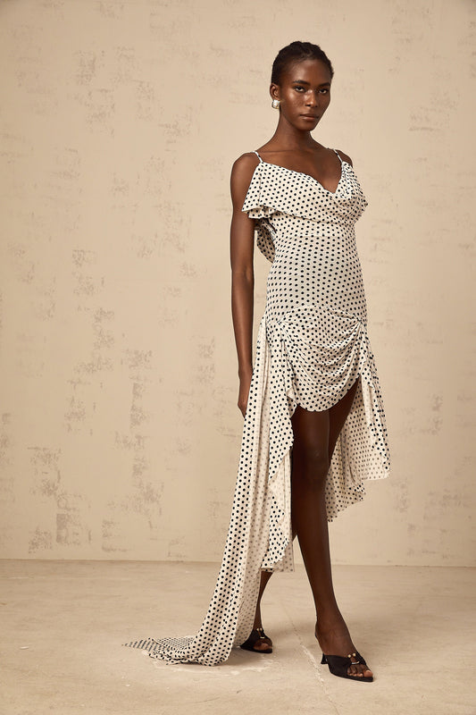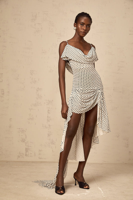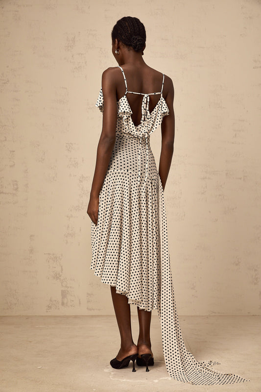 Véronica white polka-dot asymmetrical midi dress
