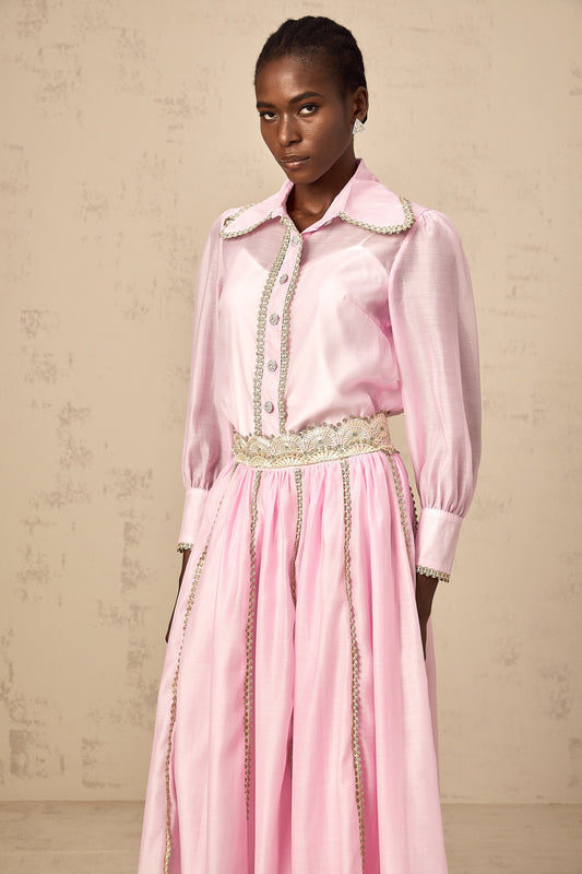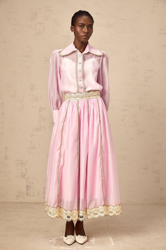 Frida pink lace-trim shirt & skirt matching set