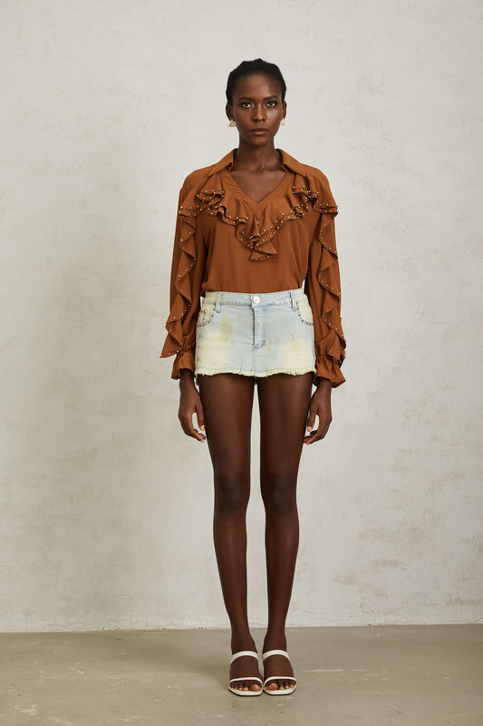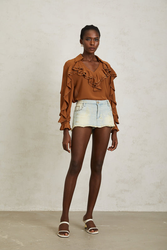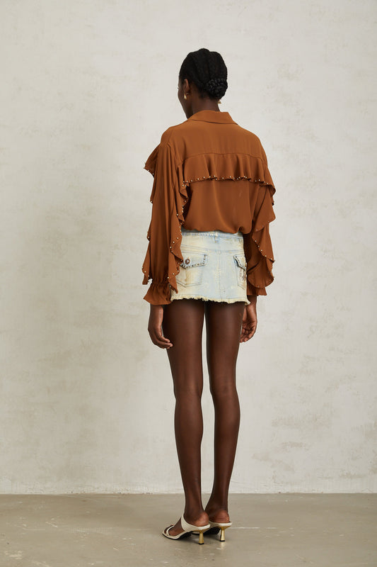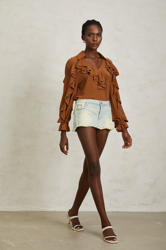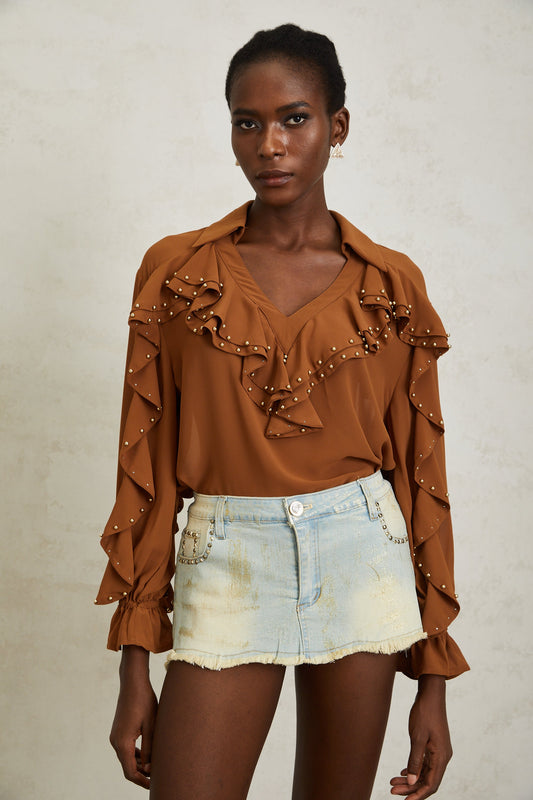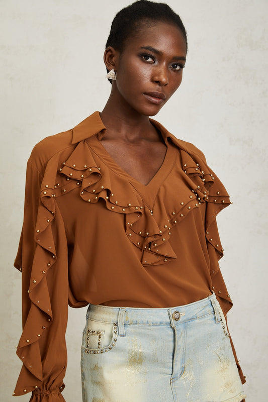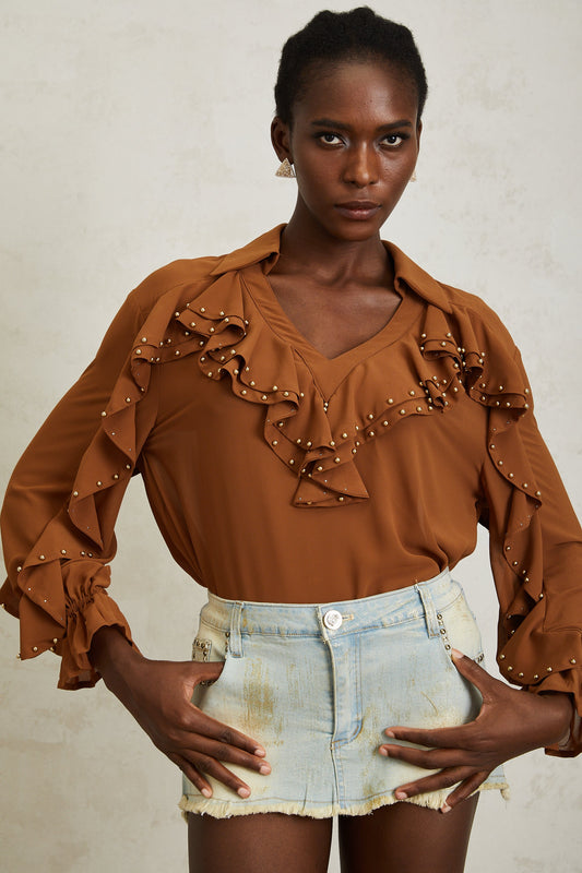 Isaline Caramel Beaded Ruffled Chiffon Blouse