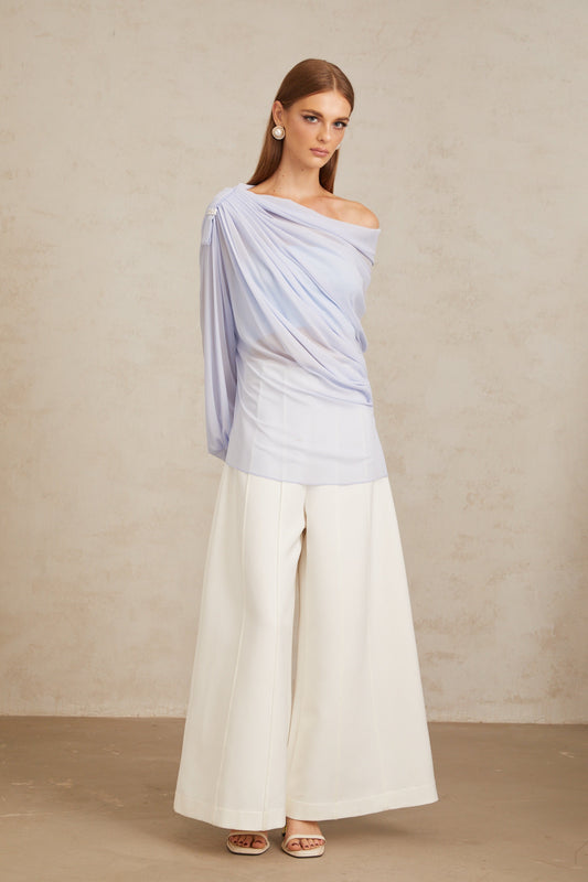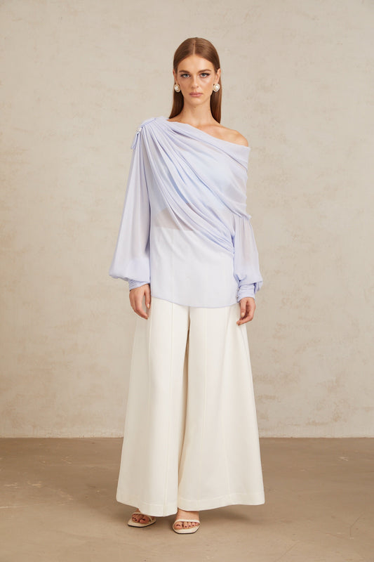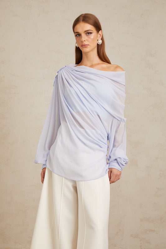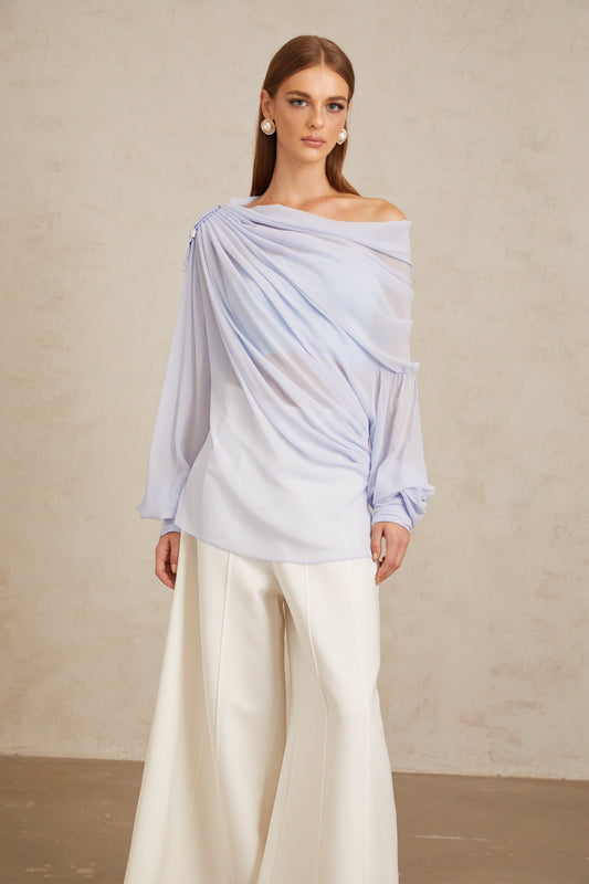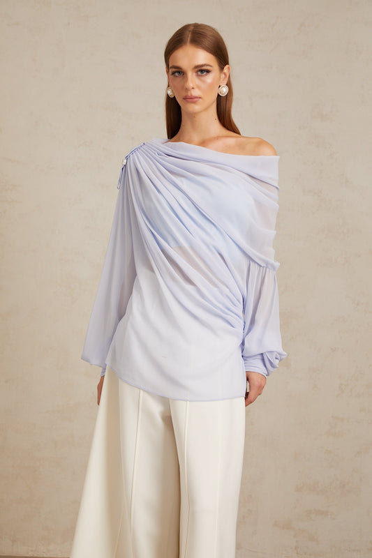 Léonie Blue Crystal Embellished Bowknot Chiffon Blouse