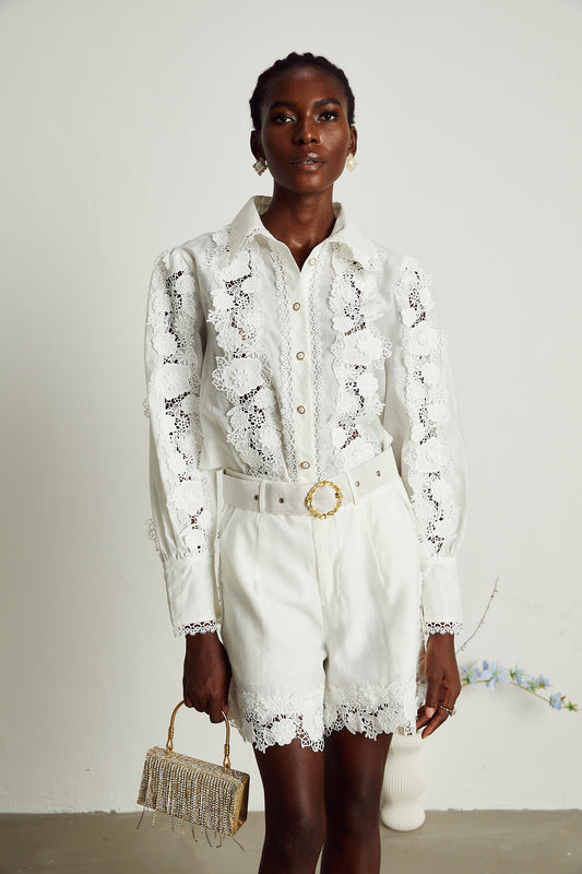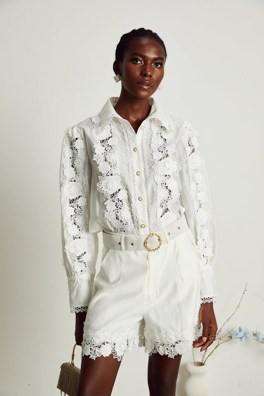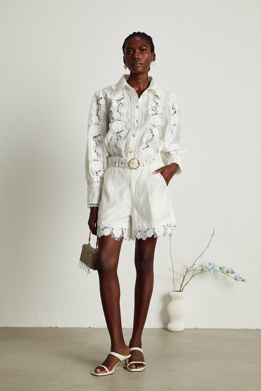Rosalie lace-trim embroidered shirt & shorts matching set