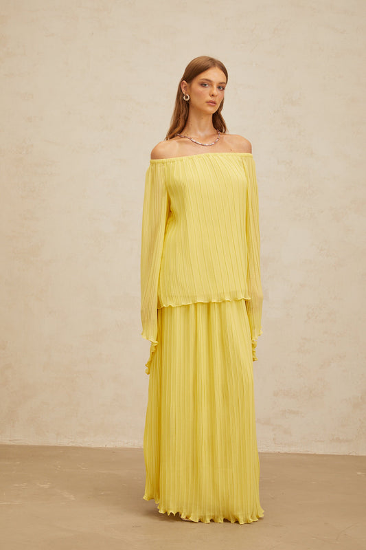 Yseult Yellow Pleated Casual Blouse & Skirt Set