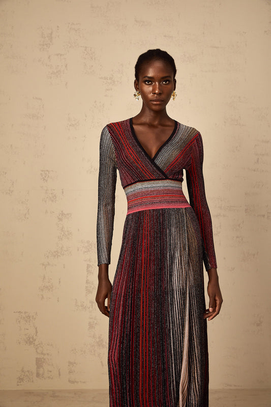 Amaryllis Red Long Sleeve Sequin Striped Knit Maxi Dress