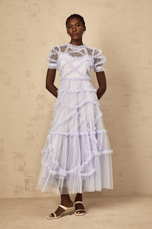 Annabelle Blue Polka Dot Ruffled Tulle Maxi Dress