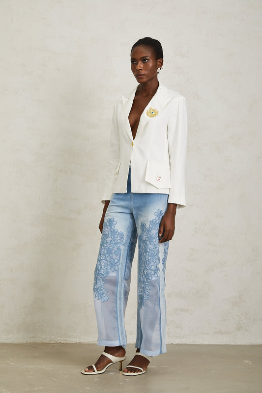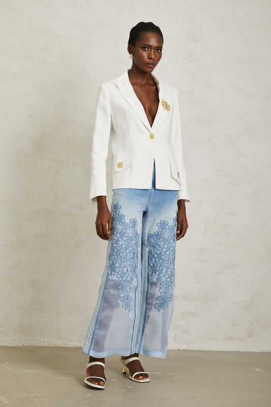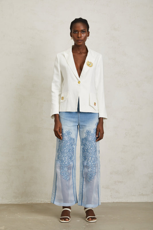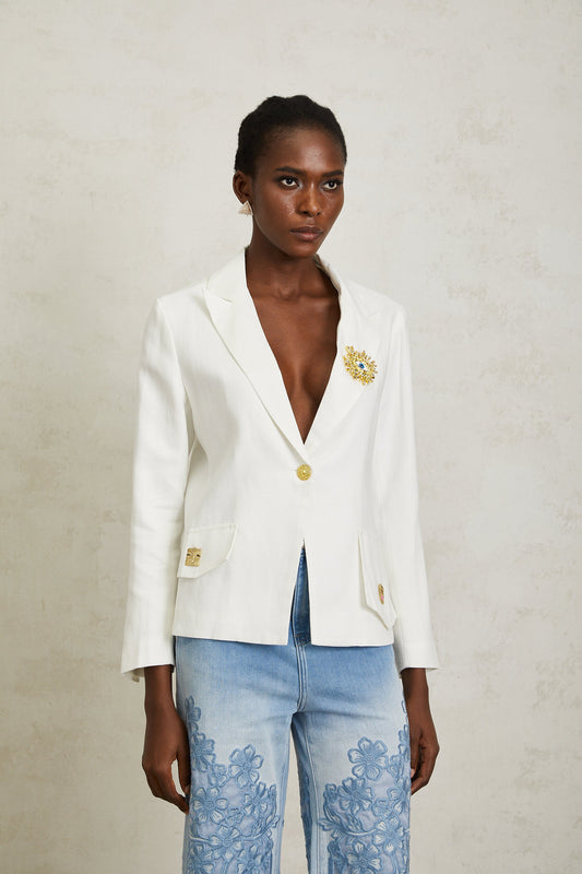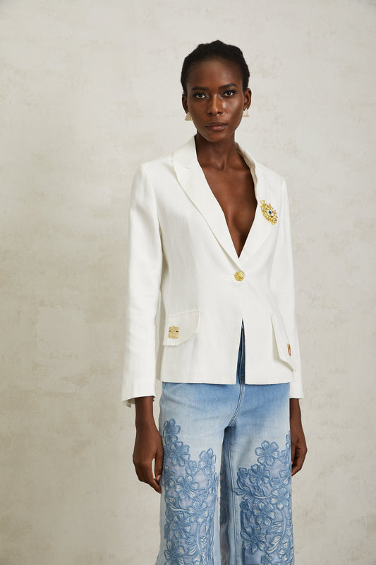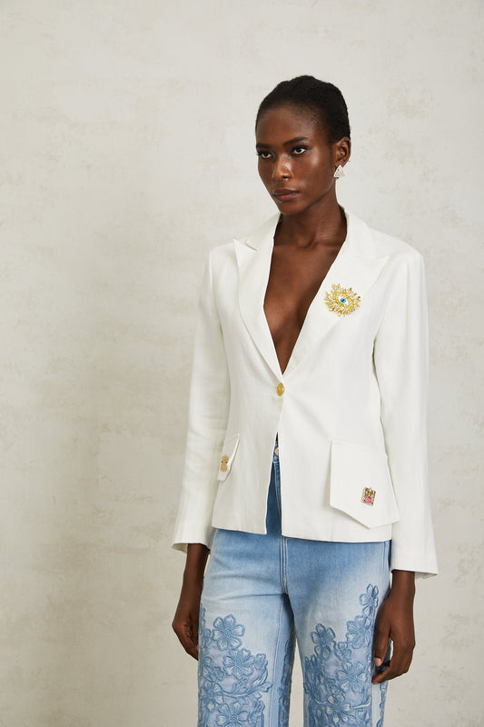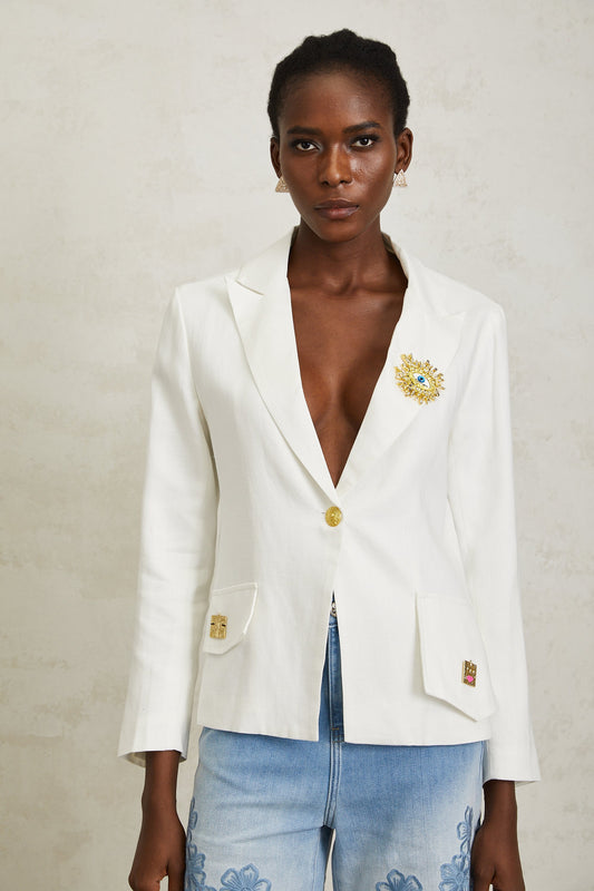 Donatienne White Brooch Detail Linen Blazer
