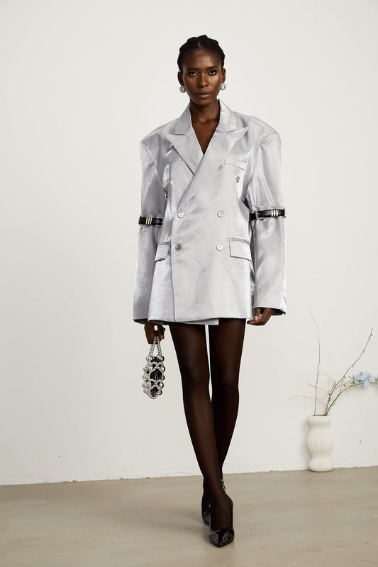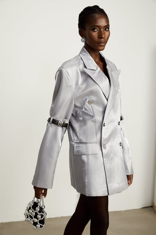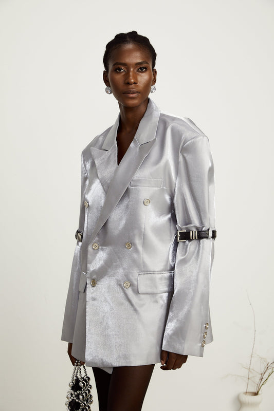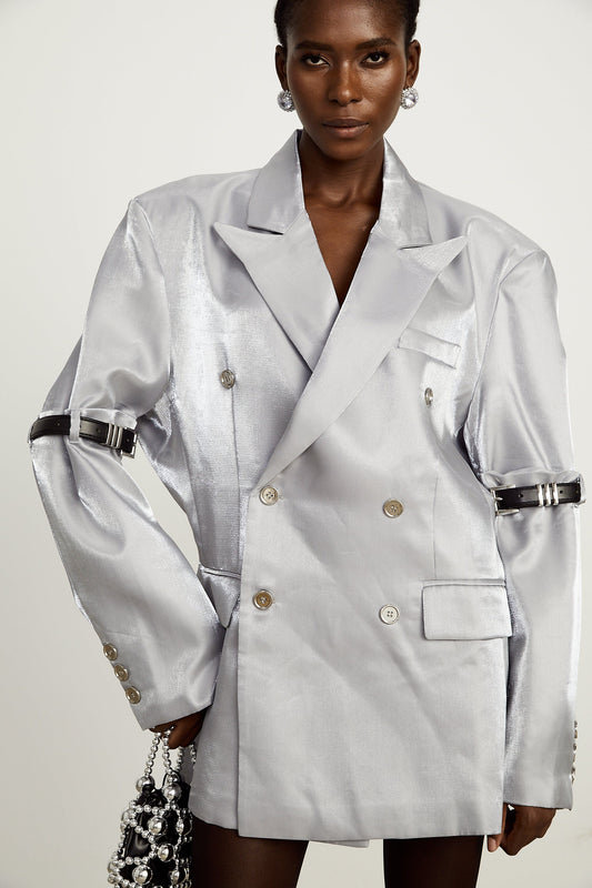 Gabrielle grey belted-arm metallic blazer