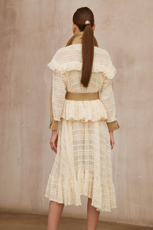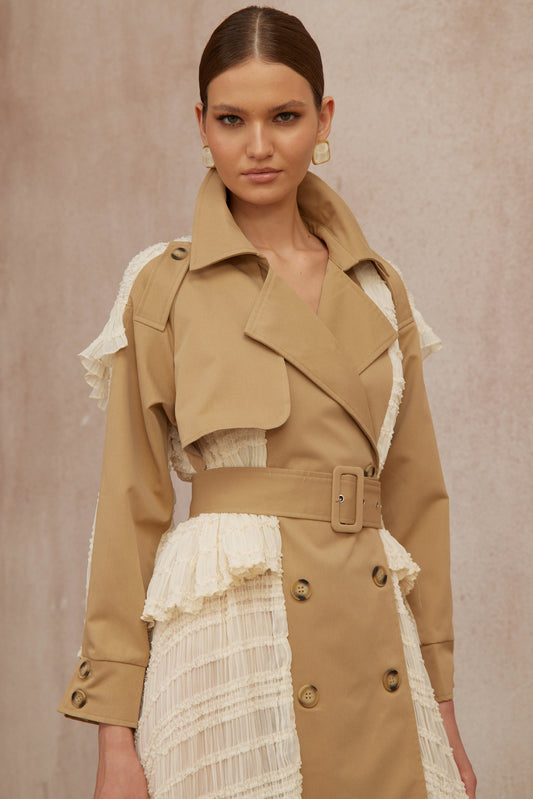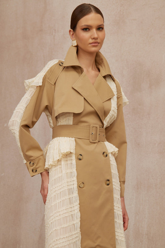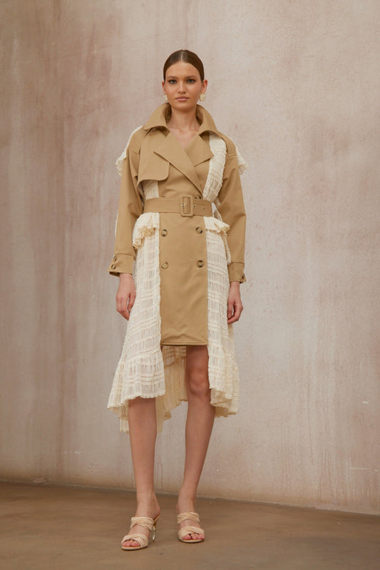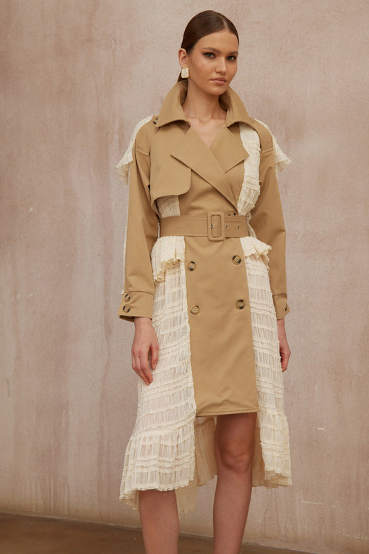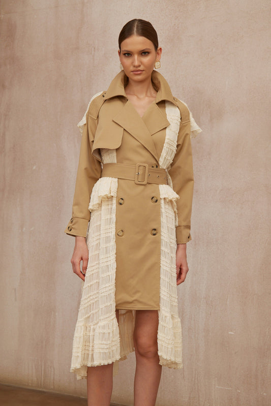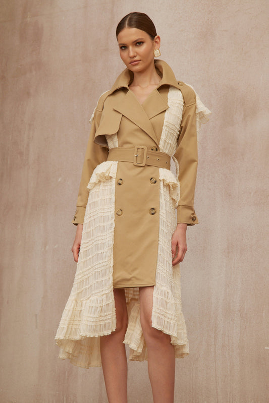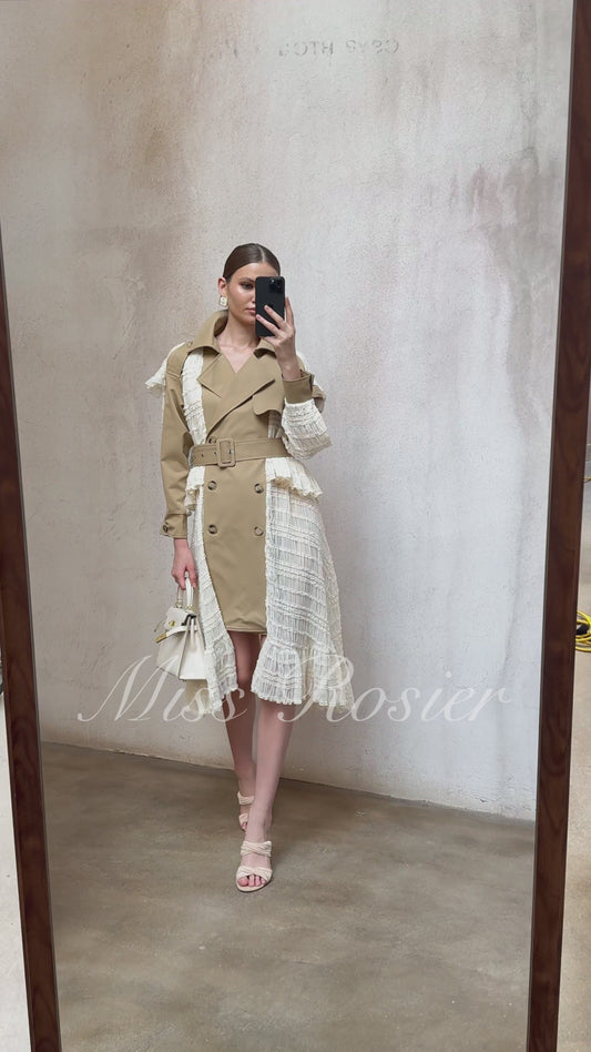 Sara Khaki Lace Panel Long Trench Coat