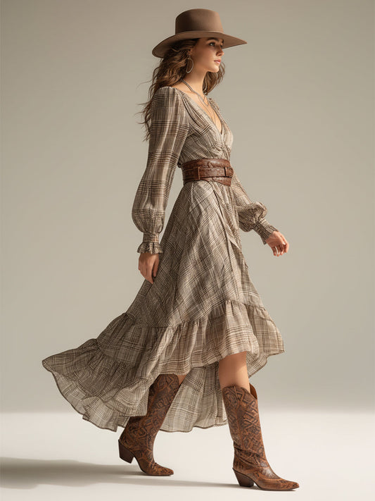 A flowy, bohemian-inspired chiffon midi dress with plaid patterns and ruffled details. It offers a relaxed yet stylish look, perfect for casual outings or outdoor events.