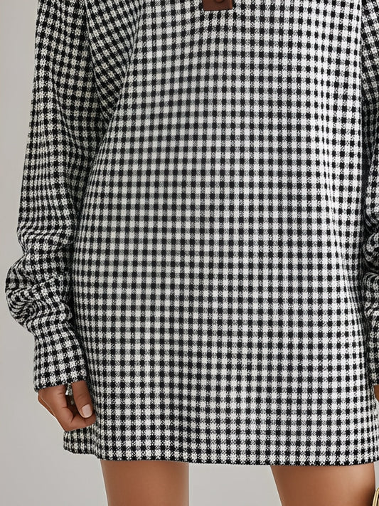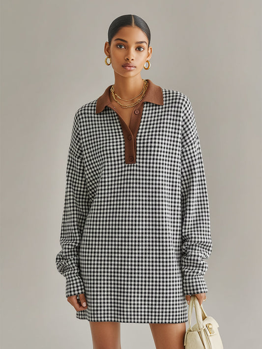 Women’s Black-White Elegant Gingham Collared Half-Button Mini Sweater Dress
