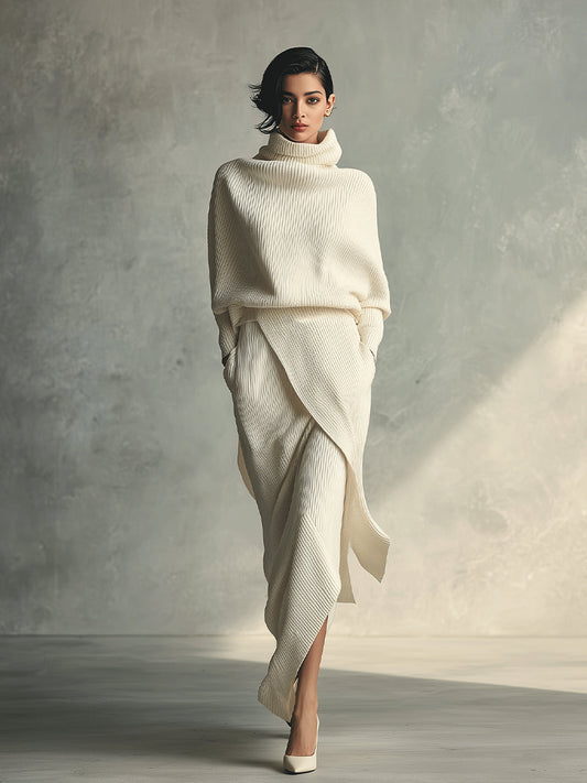 A chic cream knit set featuring a cozy cowl neck top and a wrap skirt. It offers a soft, draped silhouette for a refined, minimal look.