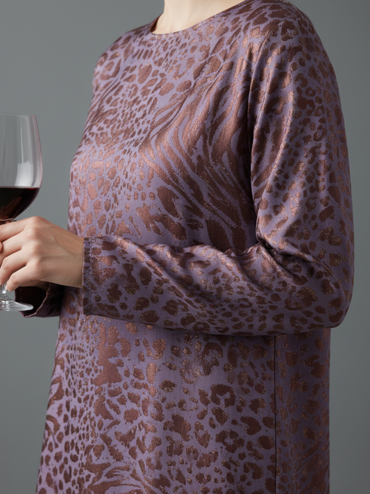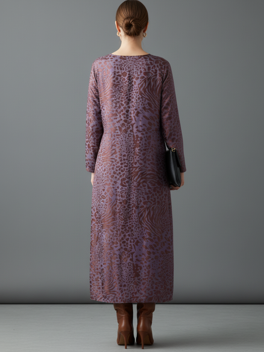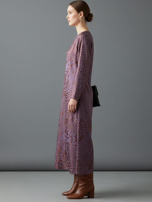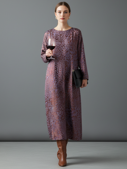 A chic midi dress featuring a bold leopard jacquard pattern, designed with a classic round neckline and long sleeves. The loose fit ensures effortless comfort and style for any occasion.