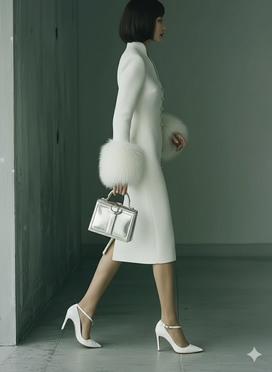 A chic white midi dress featuring a tailored silhouette with plush fur cuffs for a touch of luxury.