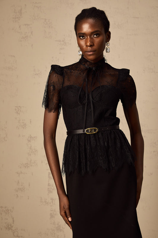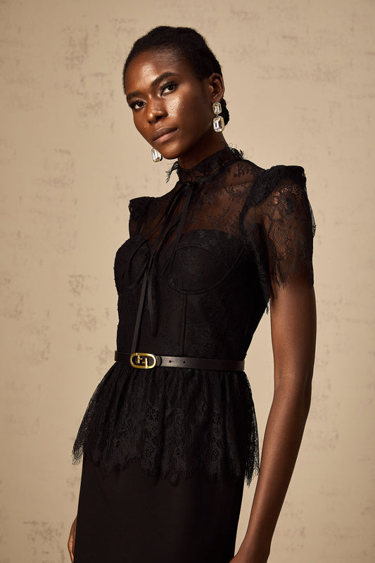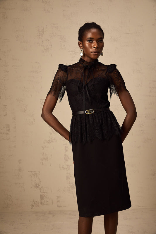 Thérèse black guipure-lace panelled midi dress (Without belt)