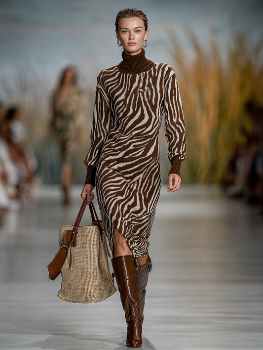 Women's Zebra Print Jacquard Knit High Collar Midi Dress