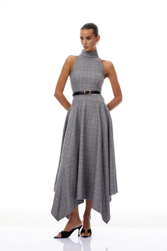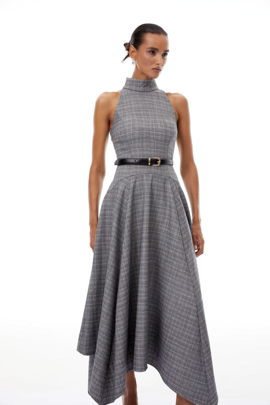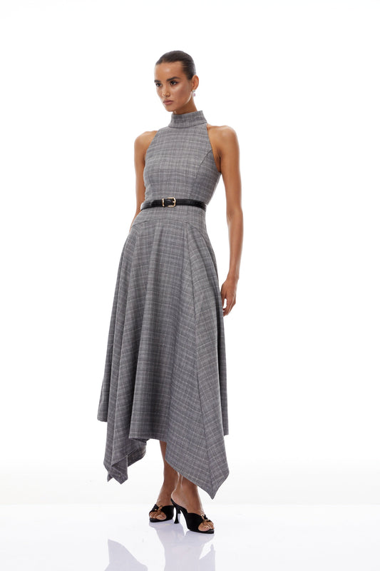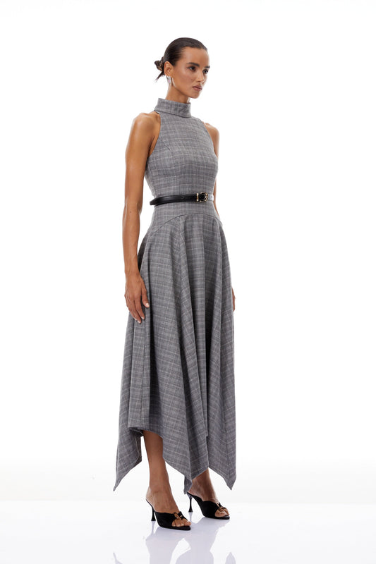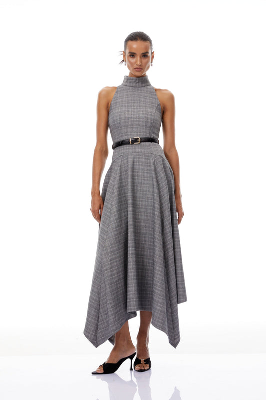 Wilhemine Grey Checked Tweed Maxi Dress (Without Belt)