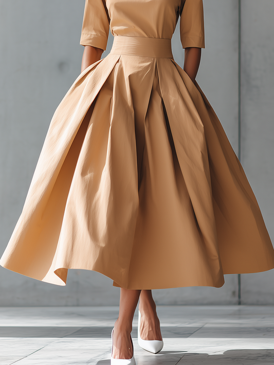 This tailored dress combines structure with softness for an elegant silhouette. Its pleated skirt and high waist create timeless shape and charm.