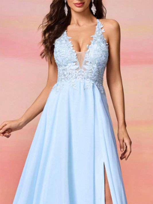 Product Name: Women’s Chiffon Lace Halter Backless Waisted Hem Slit Maxi Dress