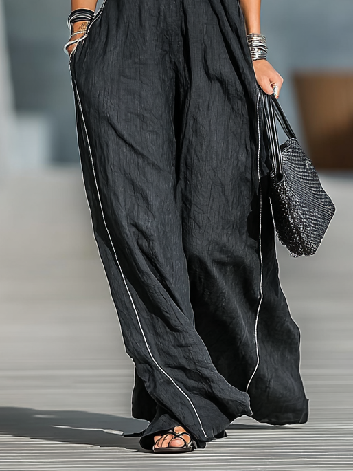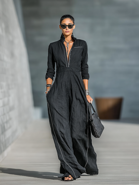 This elegant maxi dress is crafted from a breathable cotton and linen blend, featuring a stylish stand collar with white trim and a button-down front. Perfect for warm weather, it combines comfort and sophistication effortlessly.