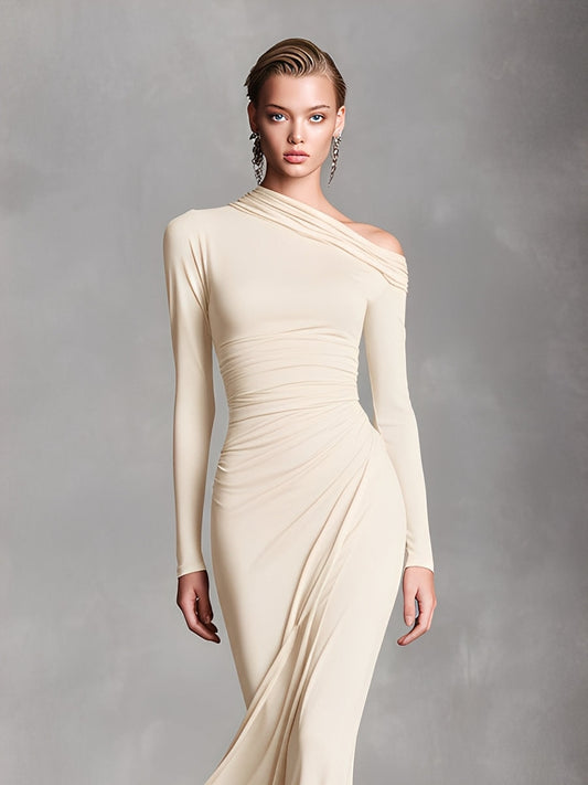 A cream jersey maxi dress with an elegant one-shoulder design and ruched detailing. It’s sleek, flattering, and perfect for formal occasions or upscale events.