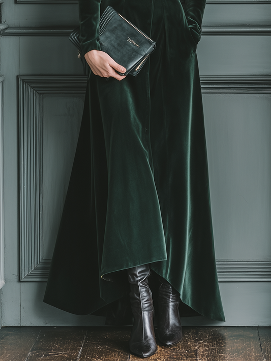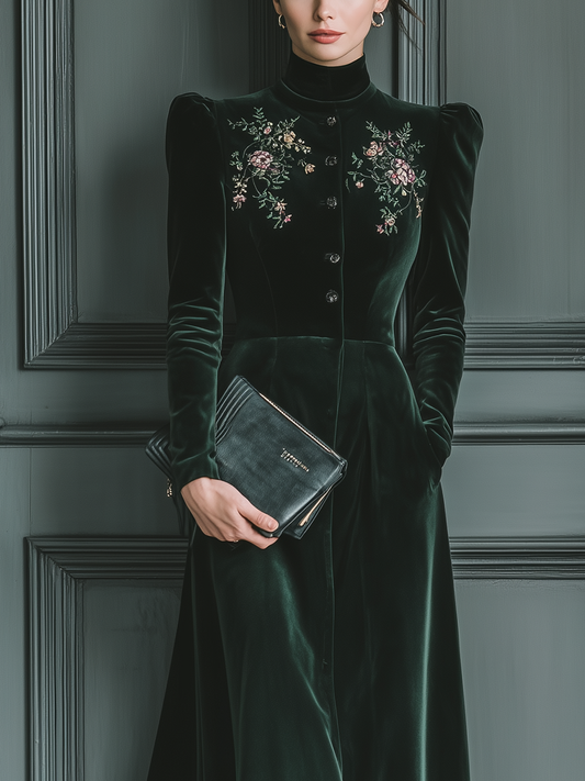 A luxurious dark green velvet maxi dress featuring a high neck and delicate embroidery for an elegant, formal look.