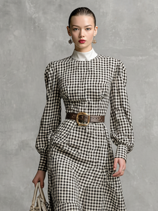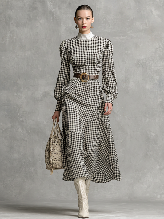 Elevate your everyday style with this elegant maxi dress, showcasing a classic plaid pattern and a chic half-high collar. The included belt cinches the waist for a flattering silhouette, while the soft, comfortable fabric and full-length design create a graceful look that’s perfect for work, special occasions, or effortlessly polished daily wear.