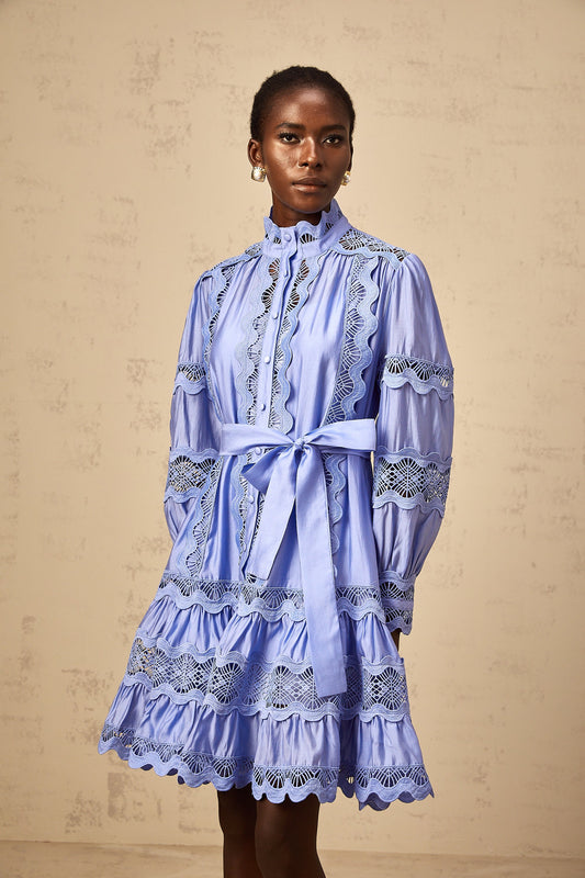 Poema blue cut-out motif-embroidered tiered mini dress