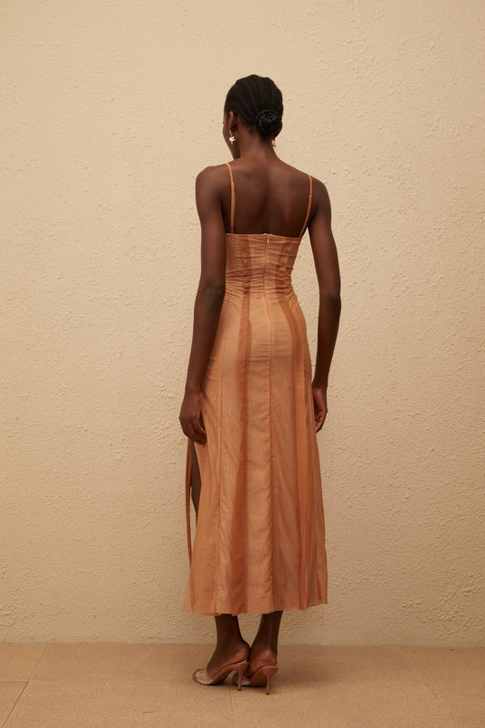 Roxane Brown Asymmetrical Tulle Maxi Dress
