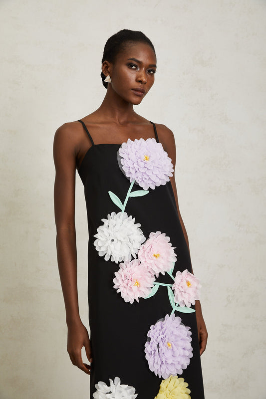 Véronique Black 3D Petal Sleeveless Midi Dress