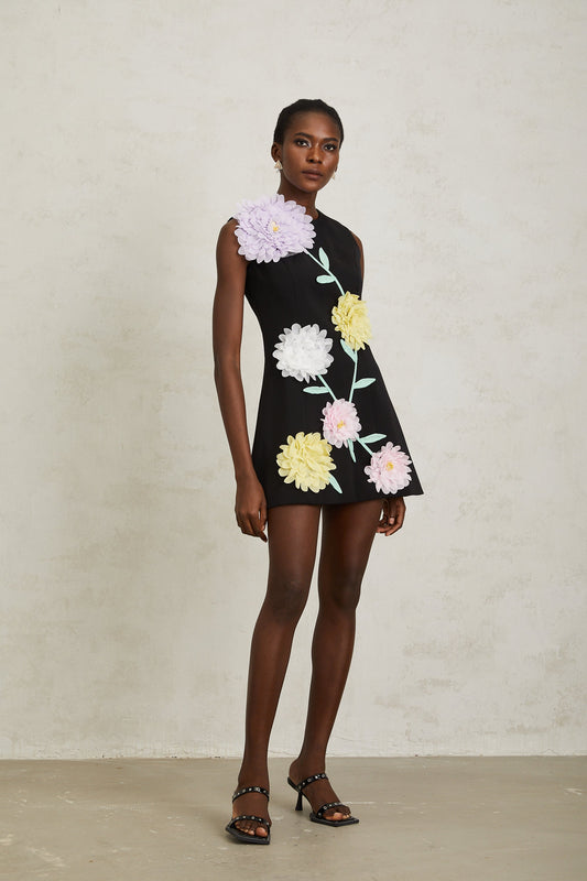 Véronique Black 3D Petal Sleeveless Mini Dress
