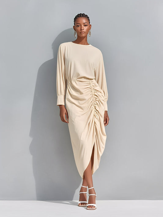 Women’s Beige Chic Cotton-Blend Ruched Side-Slit Midi Dress