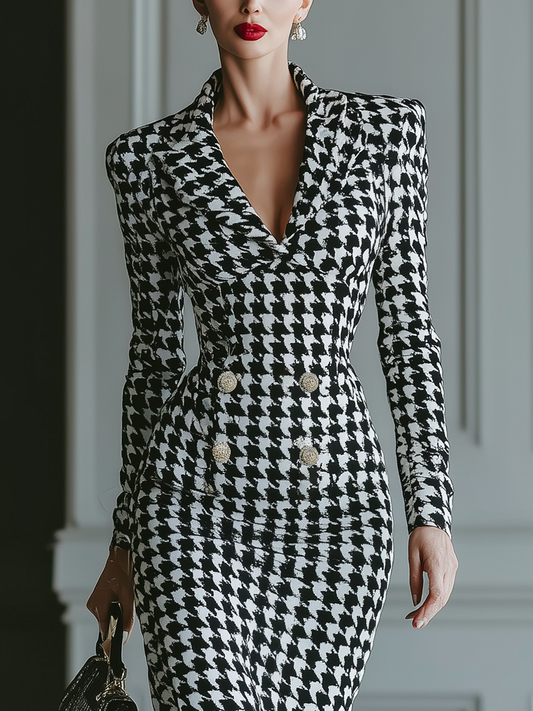 Women's Black And White Houndstooth Wool Blend Lapel Midi Dress