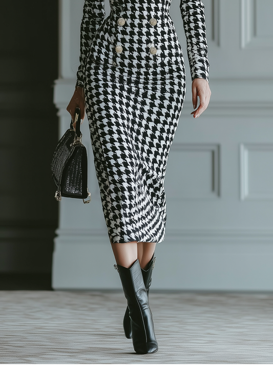 A sophisticated houndstooth midi dress in a wool blend. Features a lapel neckline and tailored silhouette for a polished, professional look.