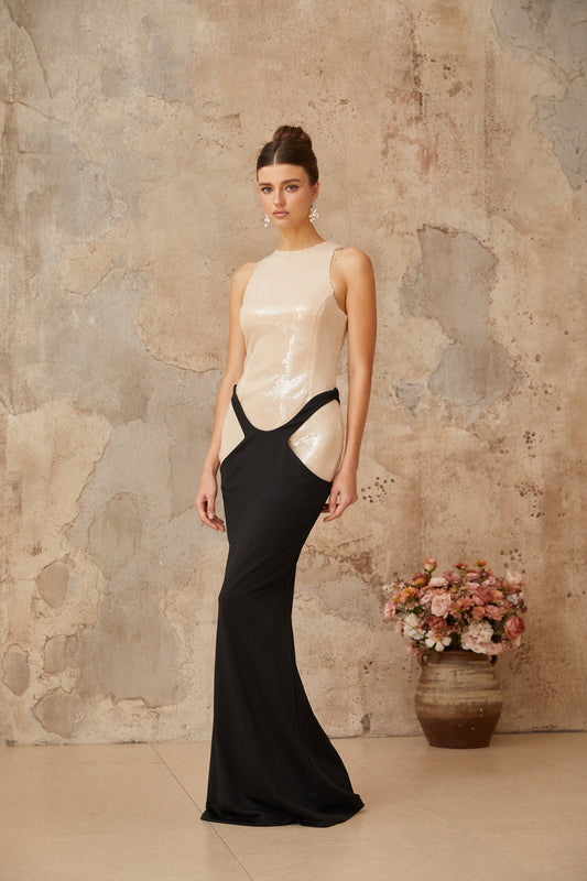 Seraphe black panelled sequined corset maxi dress