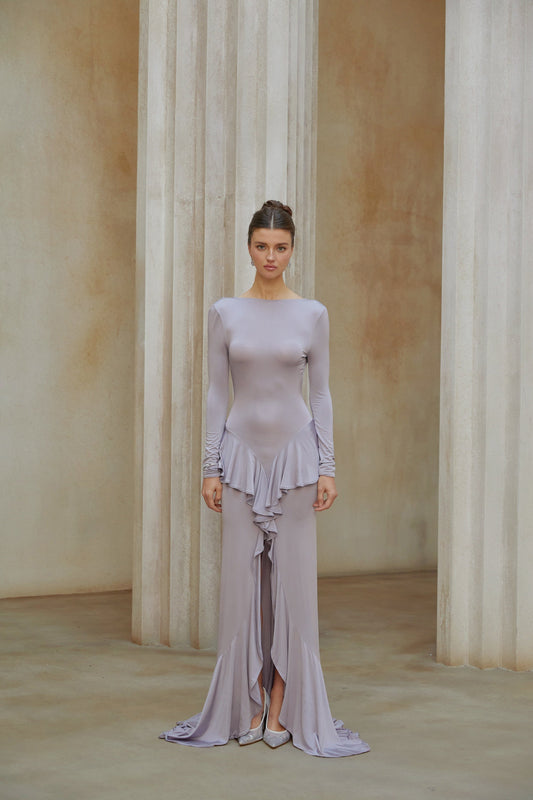 Xenia Purple Ruffle Detail Maxi Dress with Front Slit