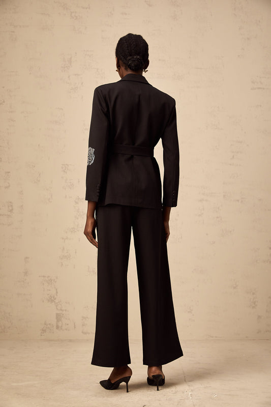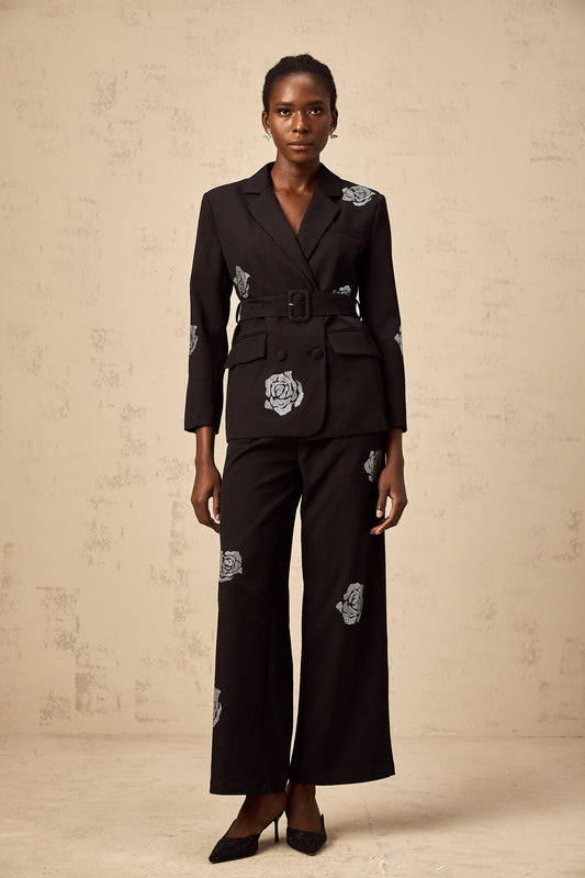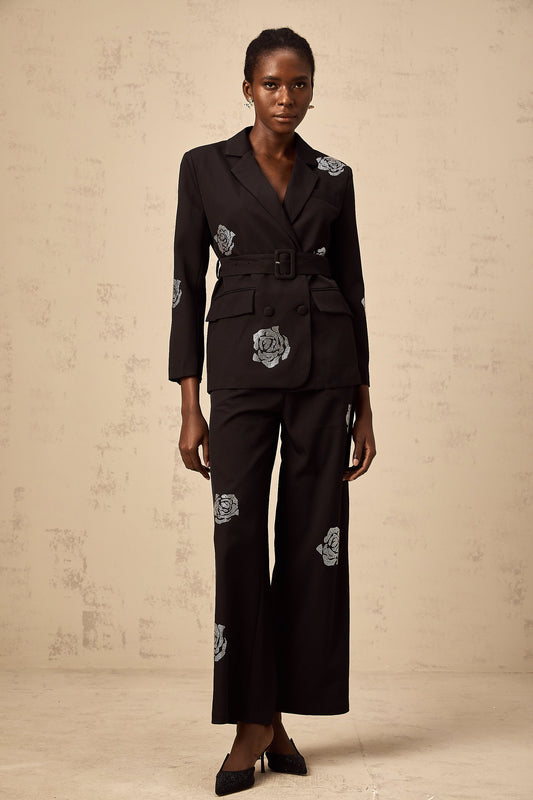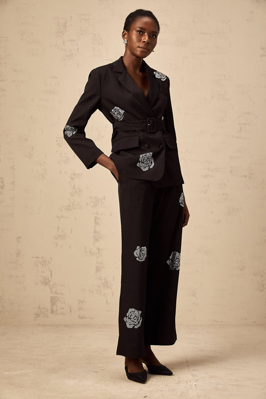Phoebe black studded-rose blazer & trousers matching set