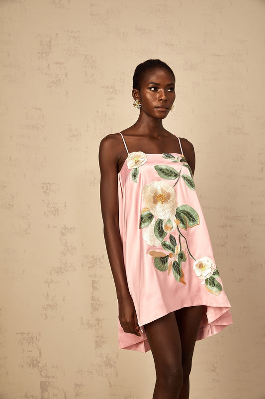 Avril Pink Floral Embroidered Satin Mini Dress