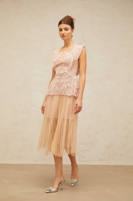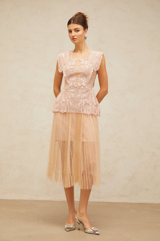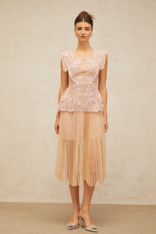 Céleste floral-lace-panelling tulle midi dress in Pink