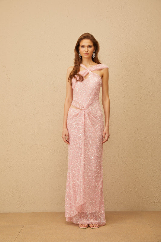Cendrine Pink Sequined Gathered Corset Maxi Dress