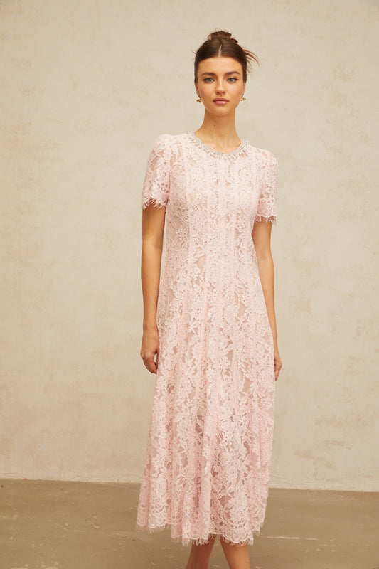 Dulcie pink embellished floral-lace midi dress