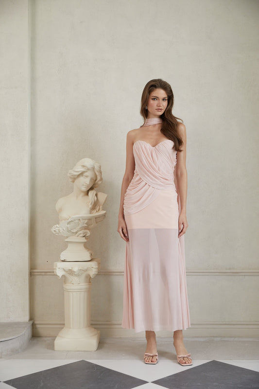Gaia Pink Ruched Mesh Maxi Dress