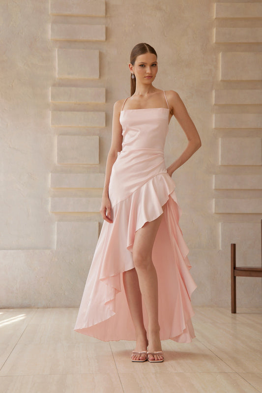 Léna Pink Asymmetrical Satin Midi Dress