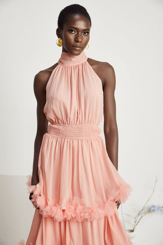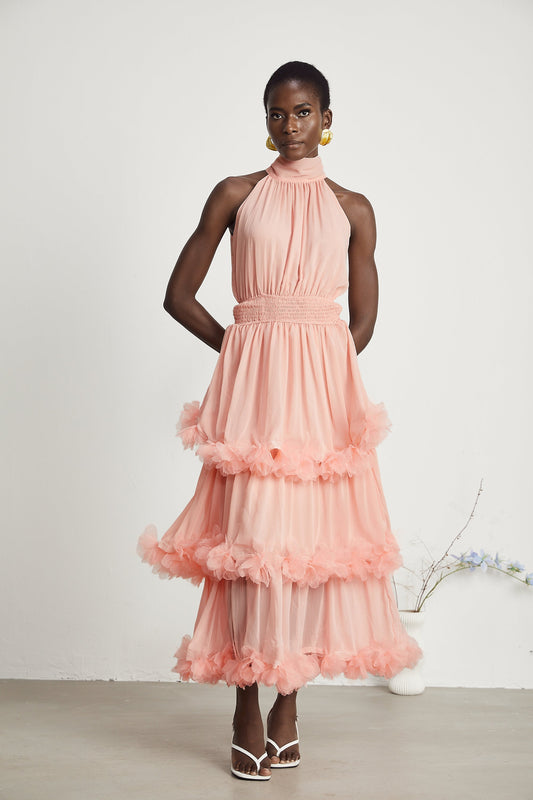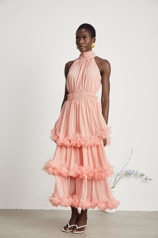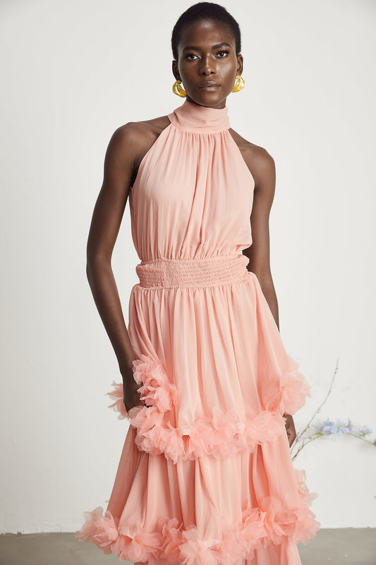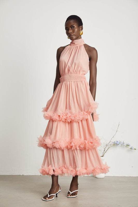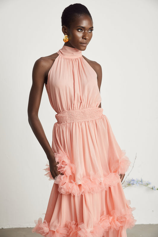 Micah pink 3D-petal tiered midi dress