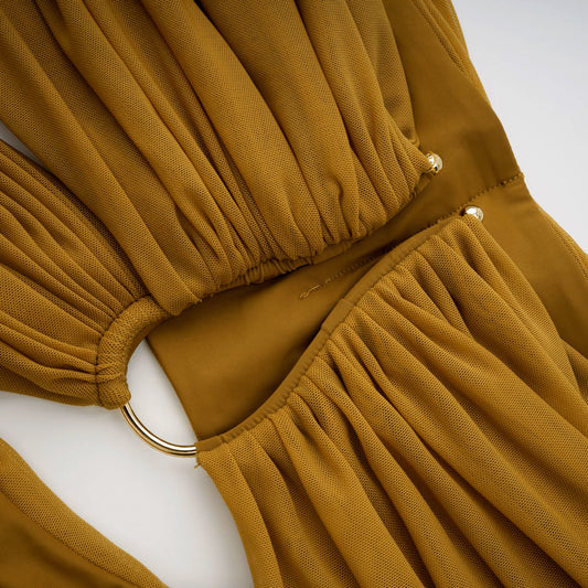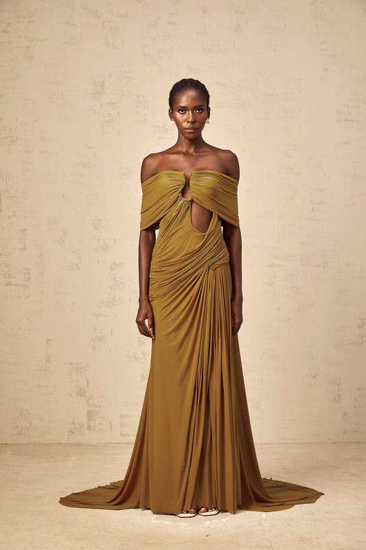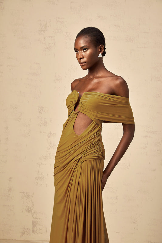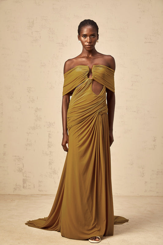 Ludivine ocher off-shoulder cut-out ruched maxi dress
