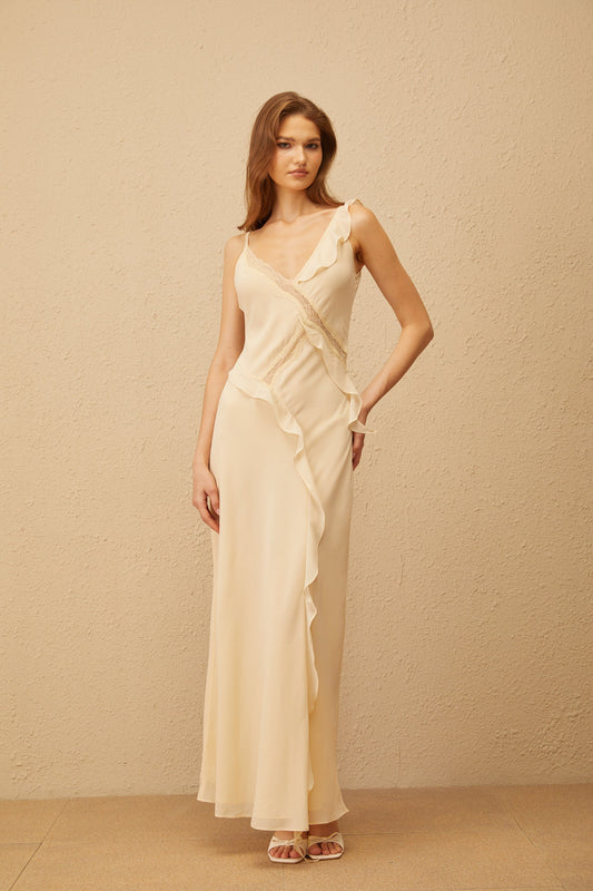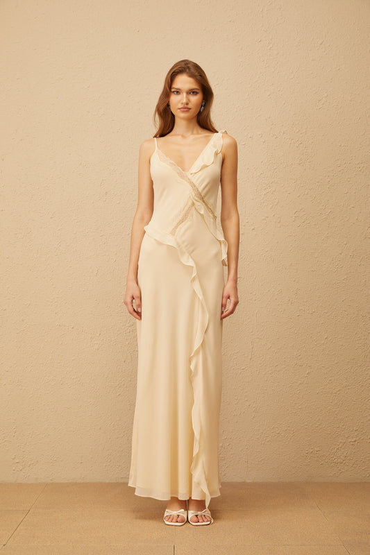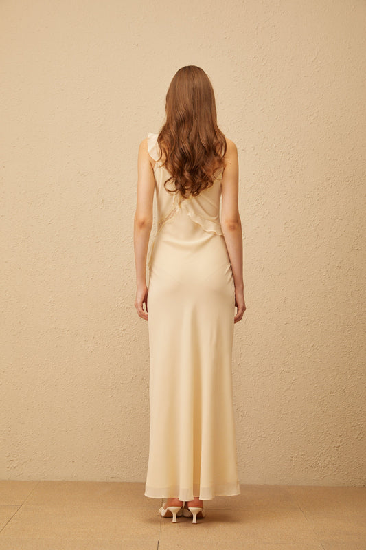 Mathilde Neutral Aysmmetrical Ruffled Trim Maxi Dress