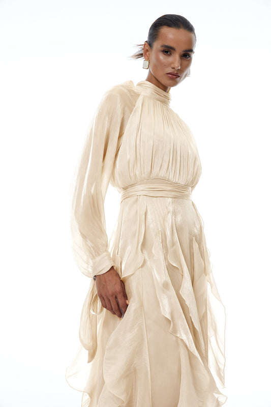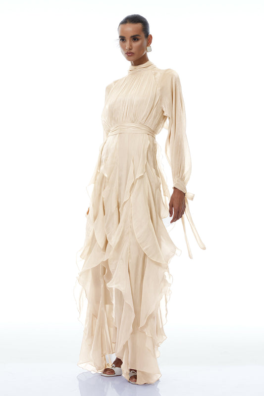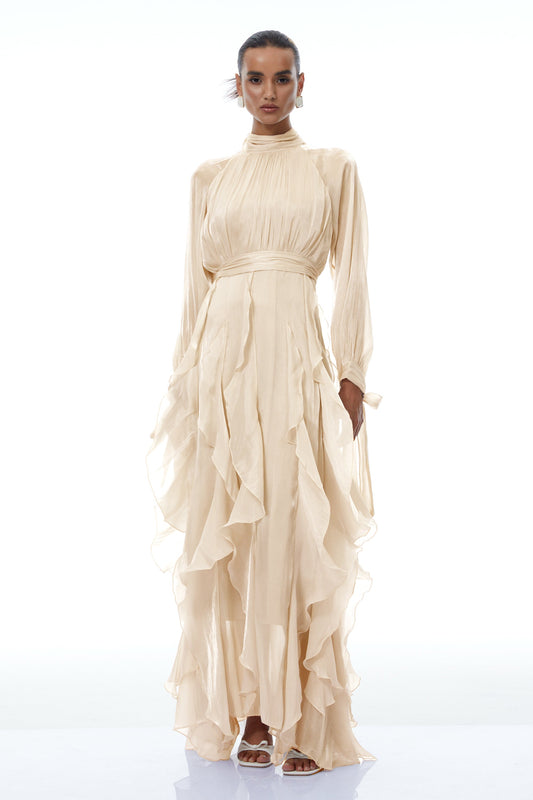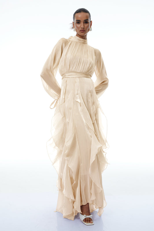 Zélie Neutral Glossy Pleated Ruffled Maxi dress