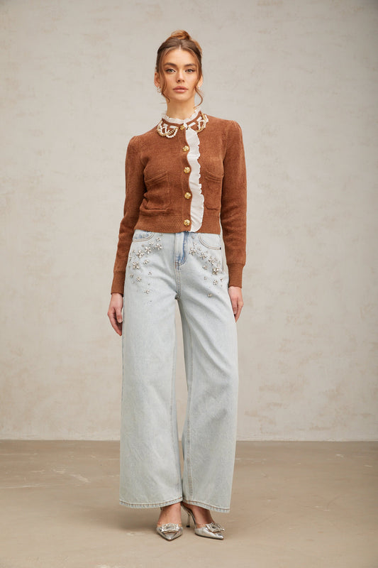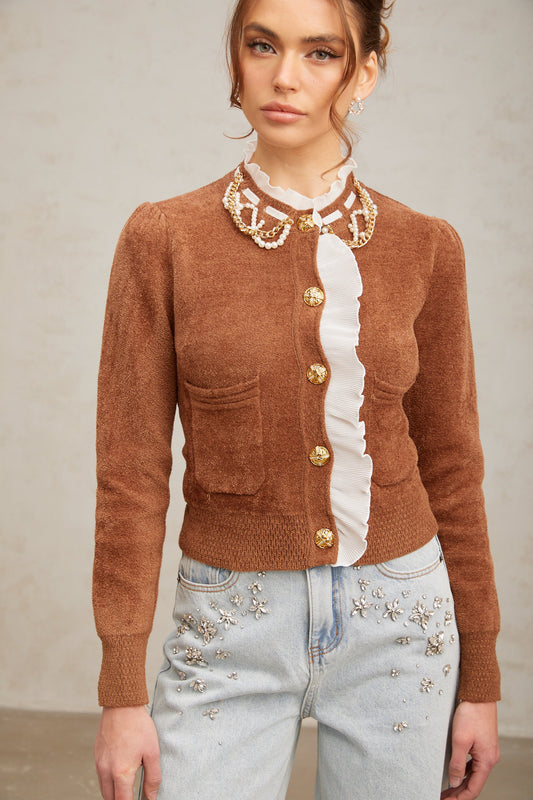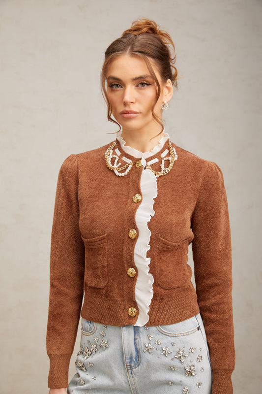 Elisabetta brown embellished ruffled knit cardigan