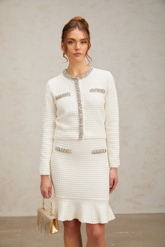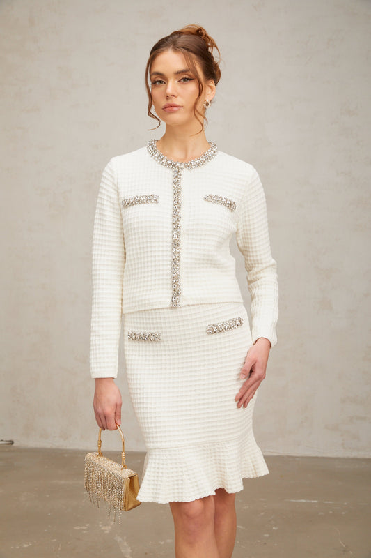 Frida white embellished waffle-knit cardigan & skirt matching set (US Only)